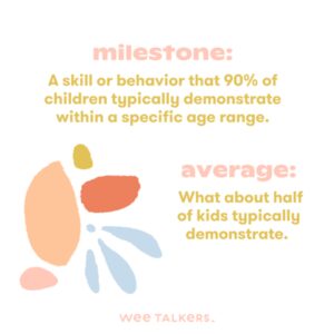 Pietre miliari: abilità o comportamenti che il 90% dei bambini dimostra tipicamente entro una specifica fascia d’età. Quindi, se consideriamo le informazioni che abbiamo appena condiviso, a 24 mesi il 90% dei bambini usa almeno 50 parole.